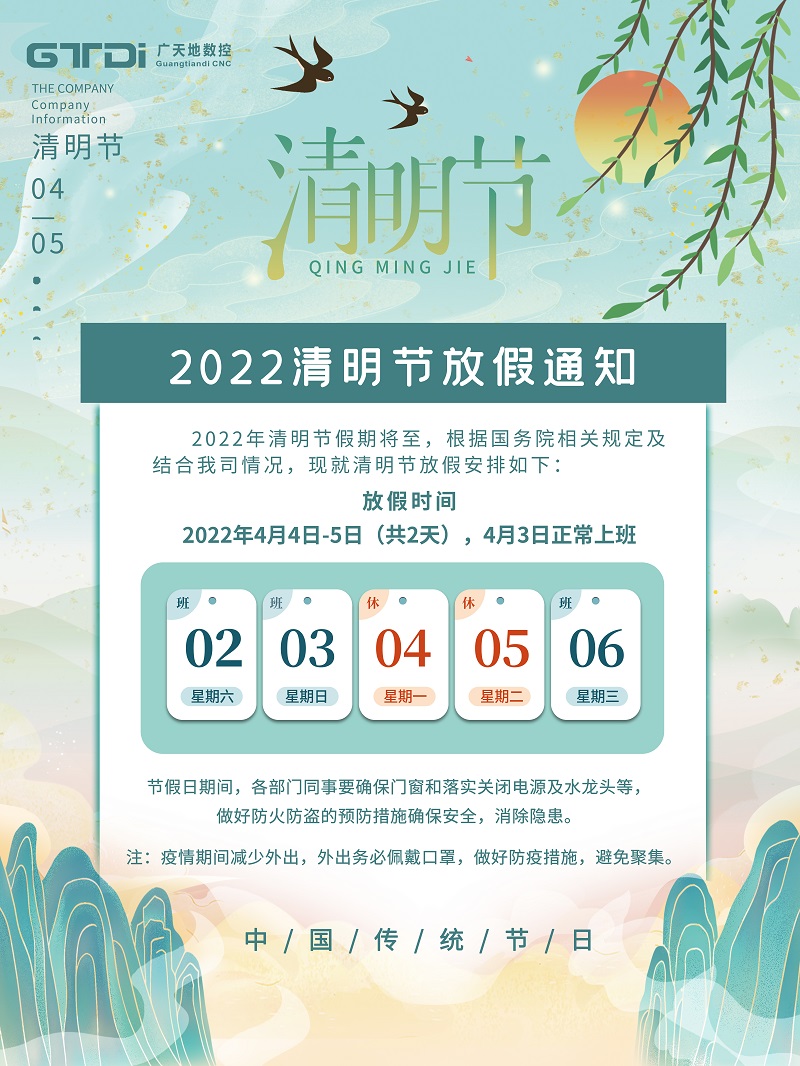 根据国务院办公厅《关于2022年部分节假日安排的通知》,并结合我司实际情况,好博体育数控2022年清明节放假安排如下: